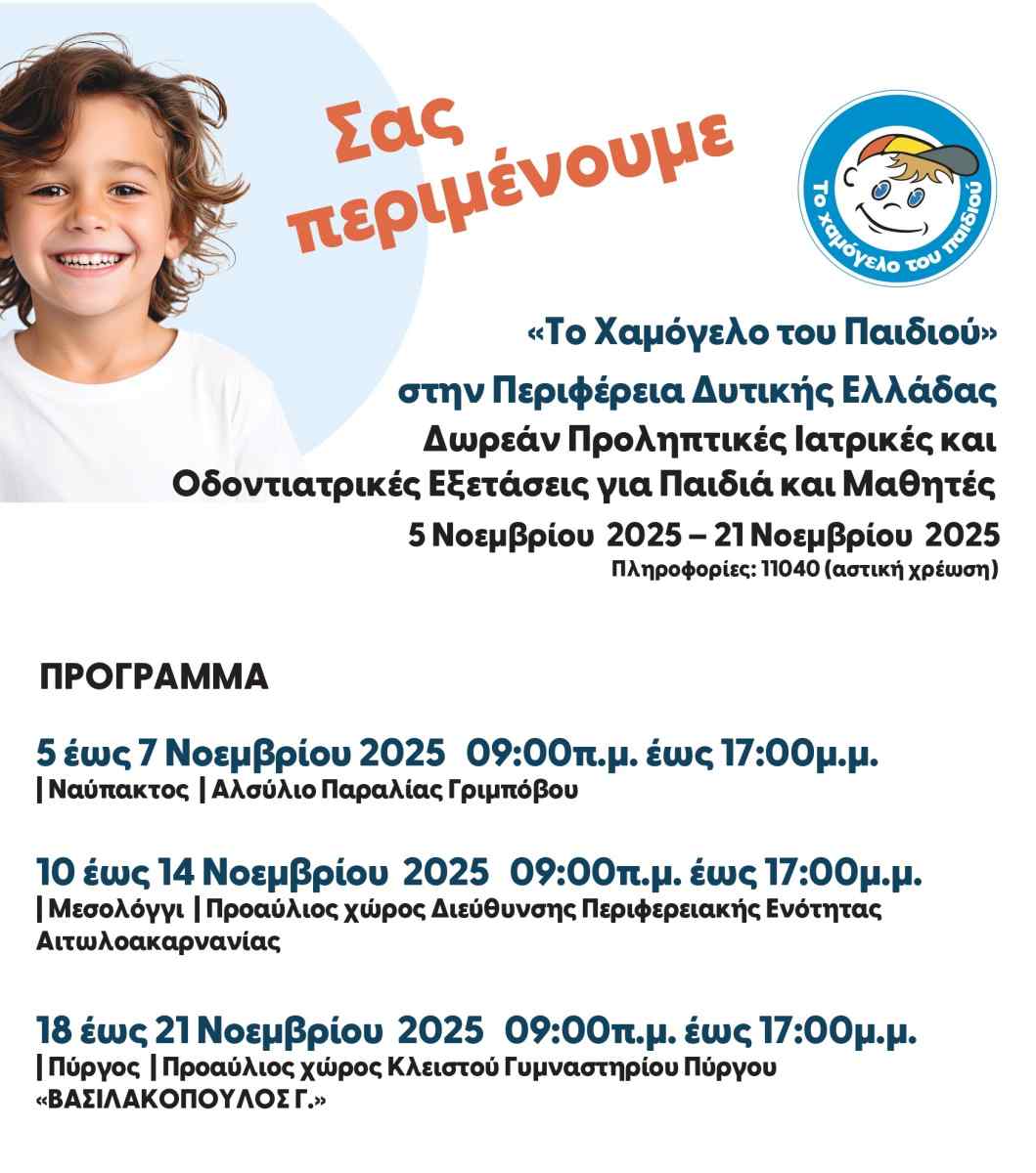 5-7 Νοεμβρίου 2025 στην Ναύπακτο για δωρεάν προληπτικές εξετάσεις στα παιδιά
