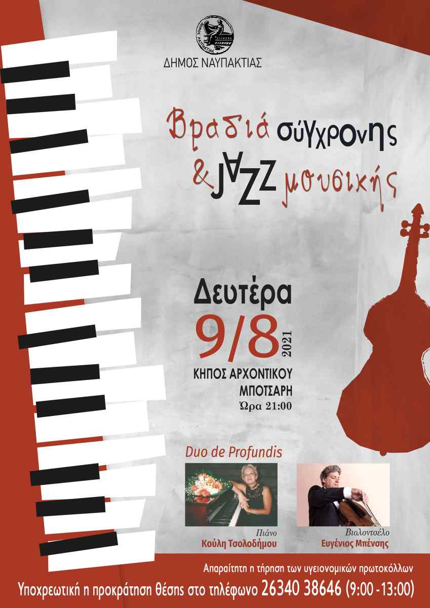 Στο πλαίσιο των Πολιτιστικών Εκδηλώσεων για το Καλοκαίρι 2021, ο Δήμος Ναυπακτίας παρουσιάζει το μουσικό σχήμα Duo de Profundis σε μια βραδιά σύγχρονης και jazz μουσικής στον Κήπο του Αρχοντικού Μπότσαρη, τη Δευτέρα, 9 Αυγούστου 2021, ώρα 21:00’.