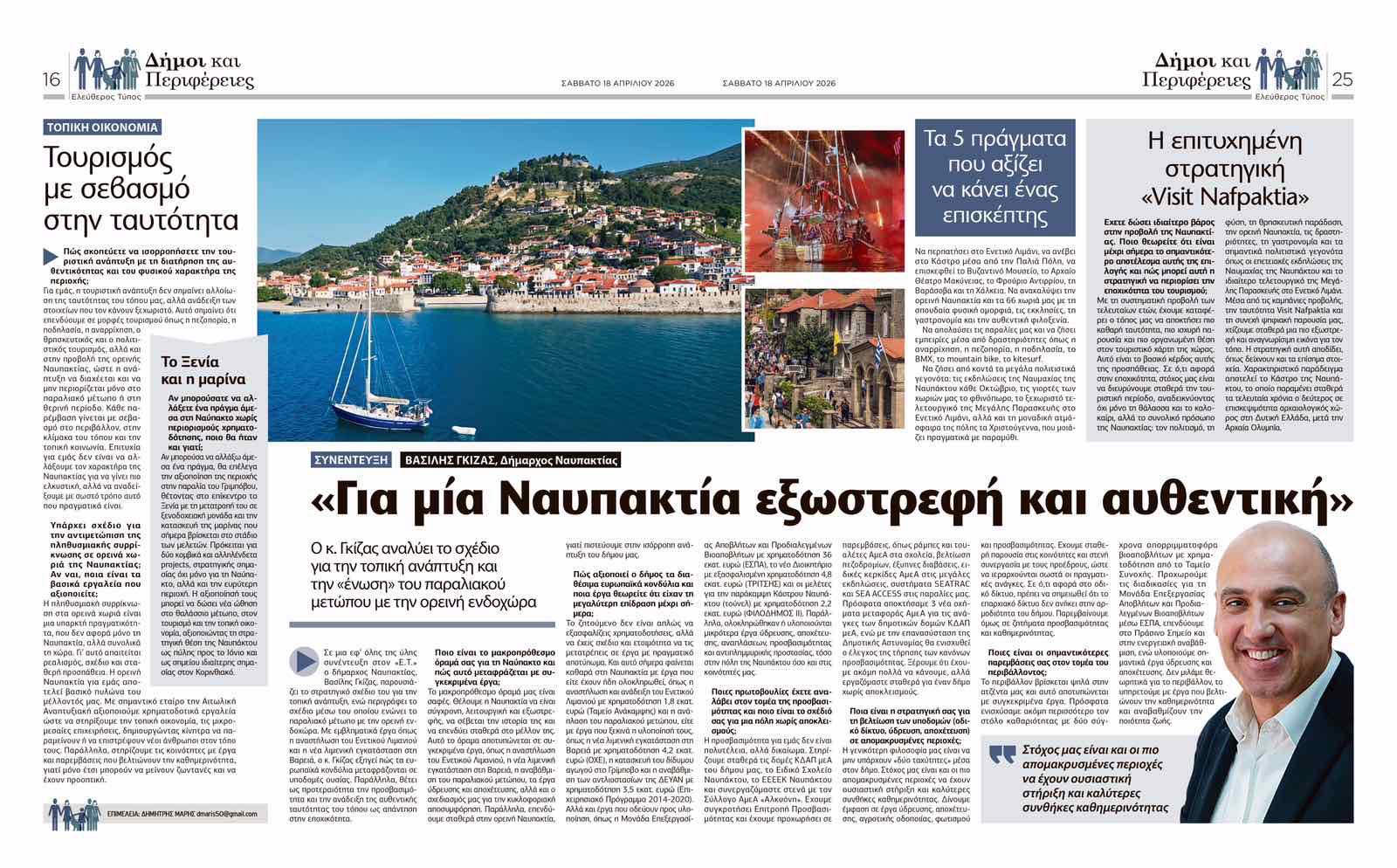 "Για μία Ναυπακτία εξωστρεφή και αυθεντική" είναι ο τίτλος της συνέντευξης που έδωσε στην εφημερίδα Ελεύθερος Τύπος και τον δημοσιογράφο Δημήτρη Μαρή ο Δήμαρχος Ναυπακτίας Βασίλης Γκίζας.