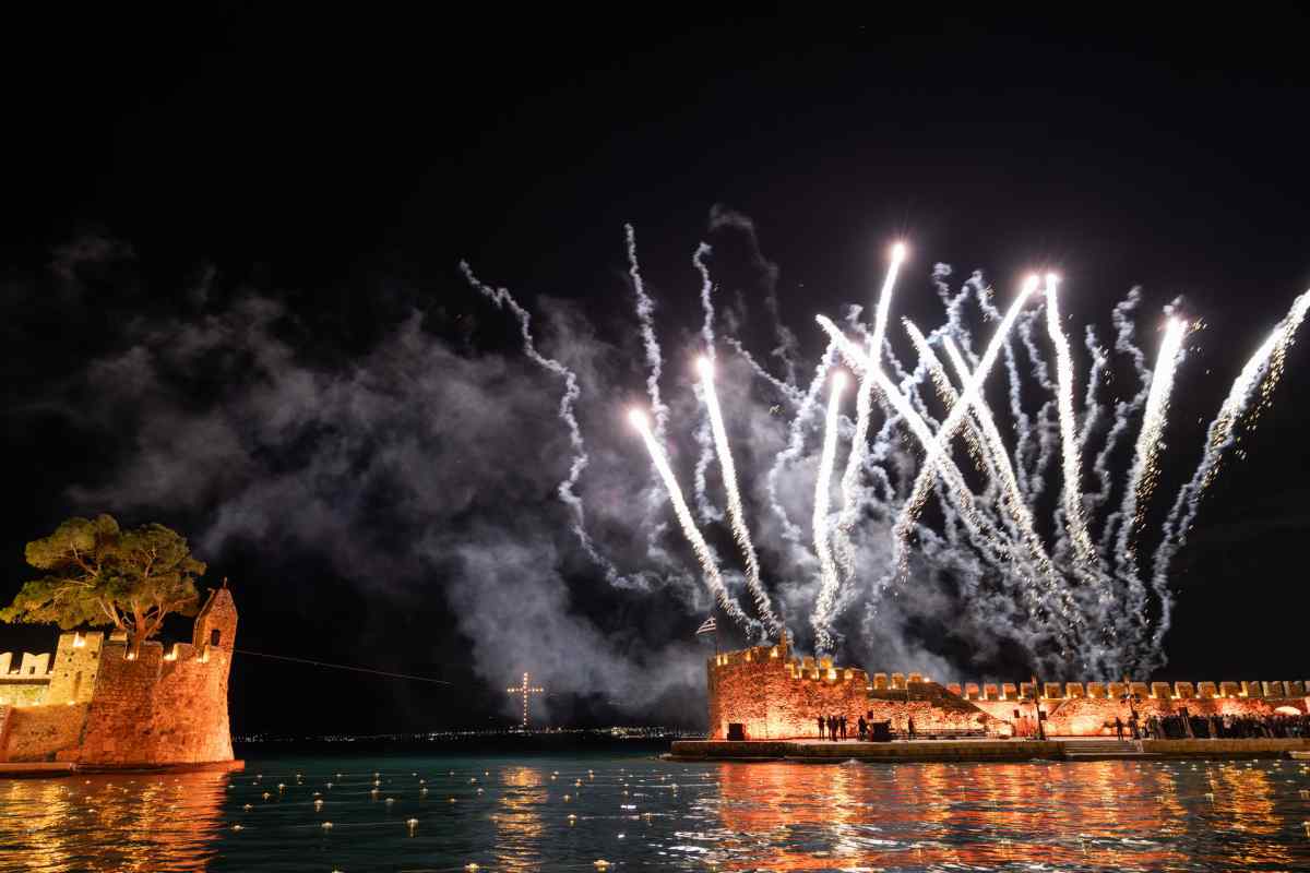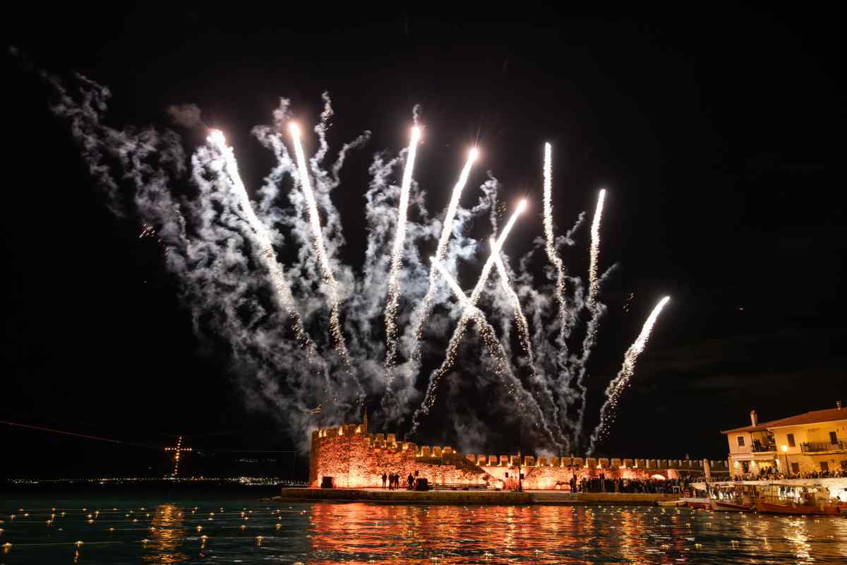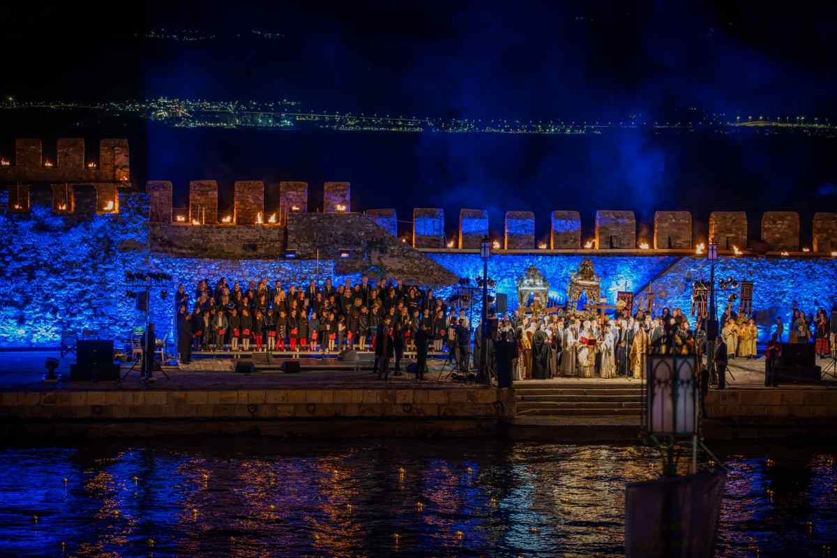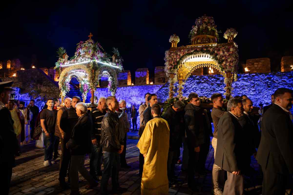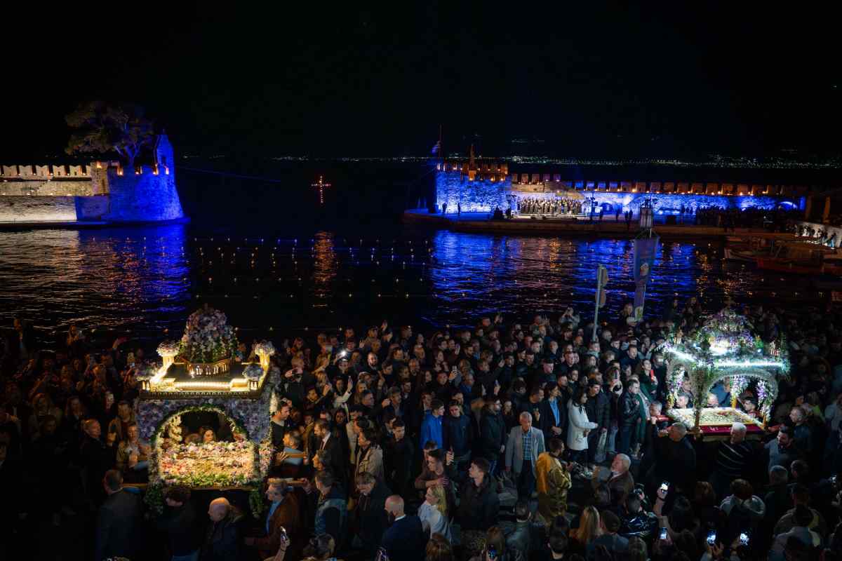 Χιλιάδες επισκέπτες κατέκλυσαν τη Ναύπακτο το βράδυ της Μεγάλης Παρασκευής, συμμετέχοντας σε ένα από τα πιο ιδιαίτερα τελετουργικά της Περιφοράς των Επιταφίων. Το Ενετικό Λιμάνι μεταμορφώθηκε σε ένα σκηνικό σπάνιας ομορφιάς και συγκίνησης, με τις πολεμίστρες να φωτίζονται από δεκάδες αναμμένες δάδες και τον φλεγόμενο σταυρό στην είσοδο να δημιουργεί μία εικόνα που δύσκολα ξεχνιέται.