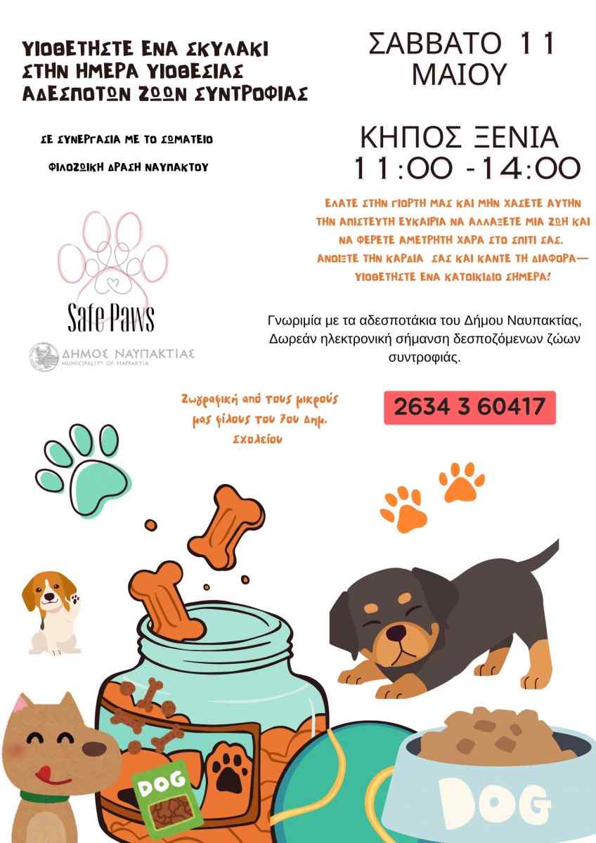 Ο Δήμος Ναυπακτίας σε συνεργασία με το Σωματείο «Φιλοζωϊκή Δράση Ναυπάκτου» διοργανώνουν Ημέρα Υιοθεσίας Αδέσποτων Ζώων Συντροφιάς, το Σάββατο 11 Μαΐου, από τις 11:00 έως τις 14:00’, στον Κήπο Ξενία.