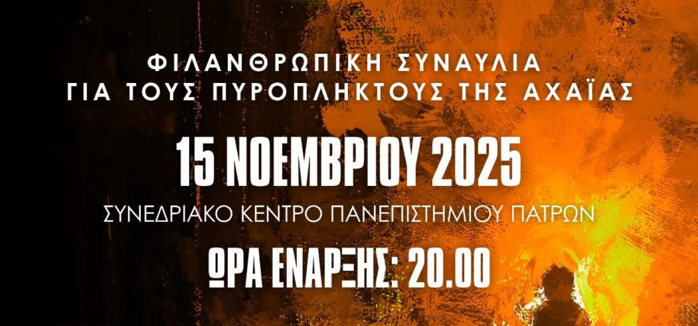 Στις 15 Νοεμβρίου 2025 και ώρα 20:00' πραγματοποιείται φιλανθρωπική συναυλία για τους πυρόπληκτους της Αχαΐας στο Συνεδριακό Κέντρο του Πανεπιστημίου Πατρών.