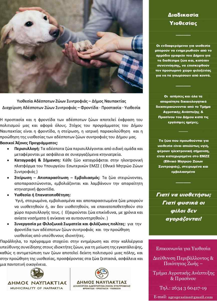 Ο Δήμος Ναυπακτίας υλοποιεί ολοκληρωμένο πρόγραμμα διαχείρισης αδέσποτων ζώων συντροφιάς, με βασικούς άξονες: